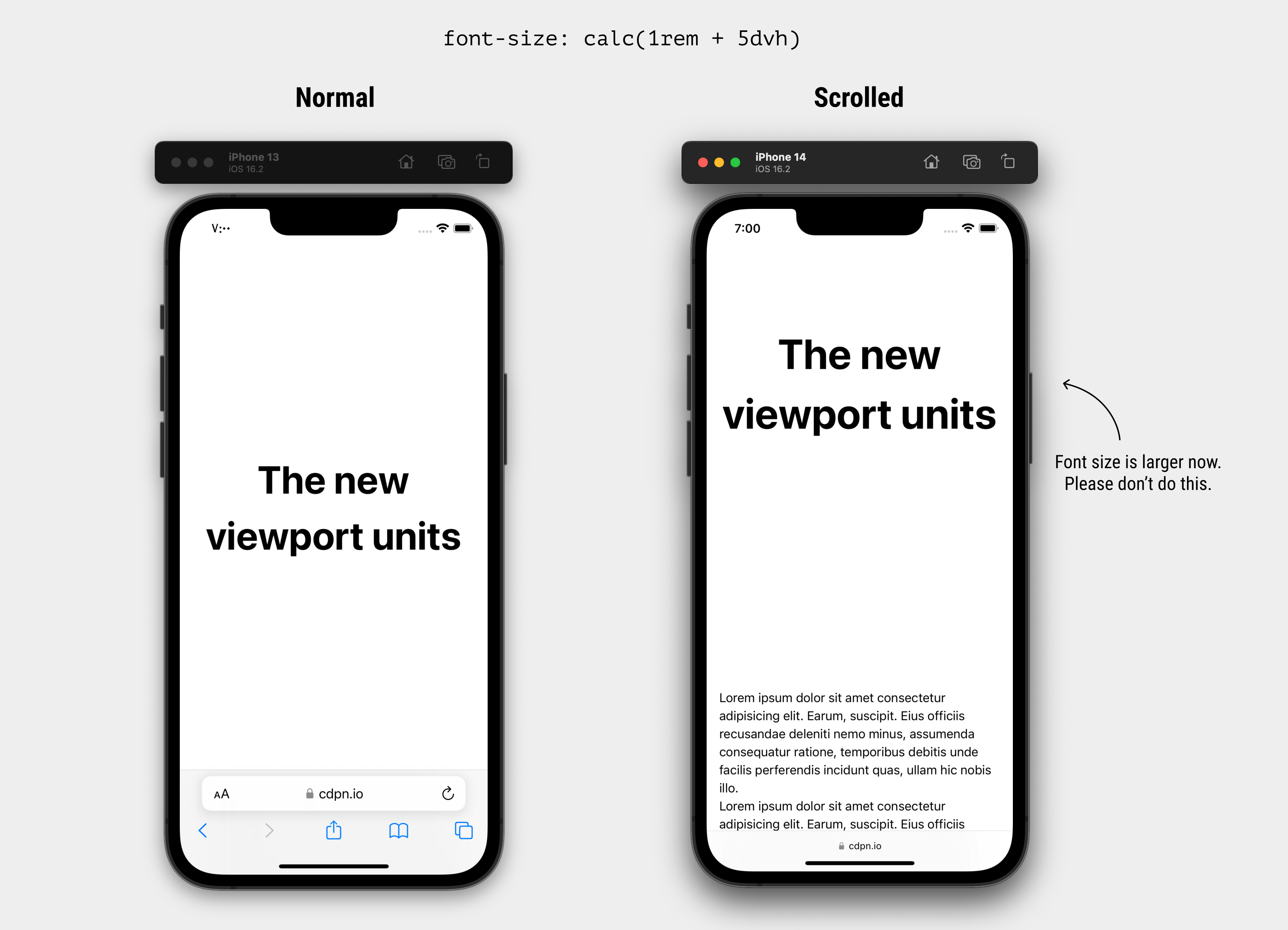 Second, the value of dvh will change as you scroll and the address bar’s behavior changes. For example, you might set the font size to correspond with dvh, and this will cause the font size to change as the user scrolls.